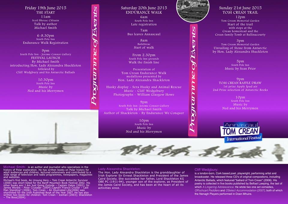 A Celebration of local legend and explorer Tom Crean. Join us in celebrating our wonderful Antartic hero Tom Crean starting Friday 19th of June 2015 until Sunday 21st of June. There will be lots going on in our village for our national and international visitors. Check out the events program below
